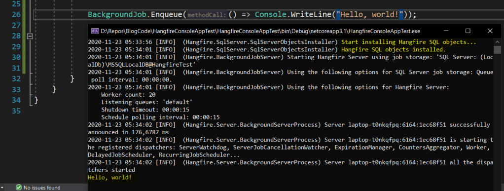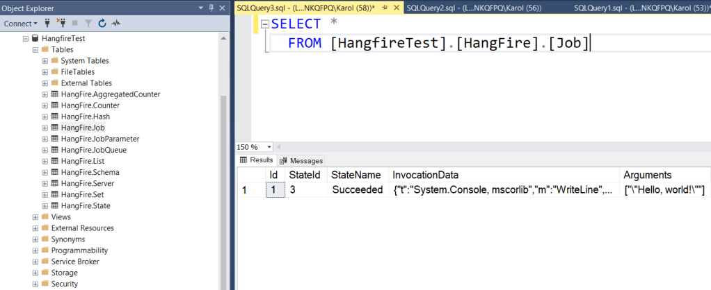 In the next blog post, I will show a simple Hangfire test application but in ASP.NET Core and with a nice dashboard to monitor tasks and e.g. how to call a controller method with Hangfire.