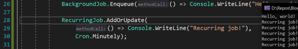 And every minute it displays: “Recurring job!”. We can configure the time period in the Cron expression, in this sample it is Cron.Minutely.