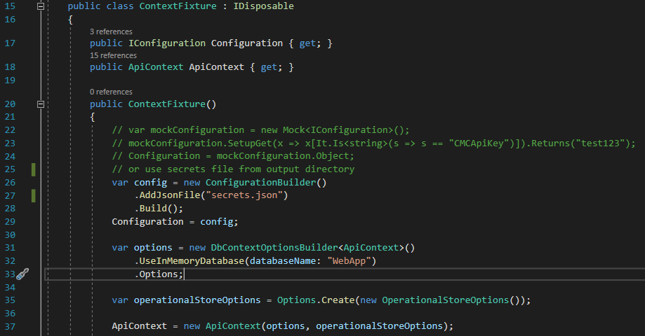 or copy secrets.json configuration file to output directory: projectName\bin\Debug\netcoreapp3.1 and then use following code in ContextFixture: